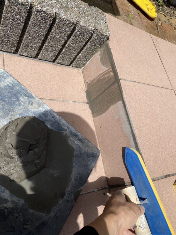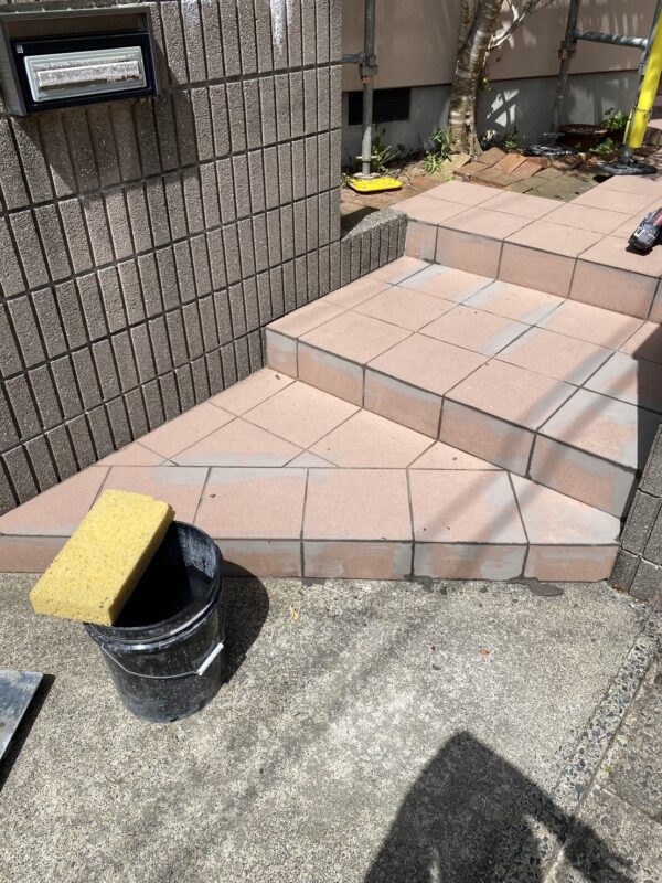階段のタイル部分は目地が剥げていたので、モルタルをすりこんで補修。