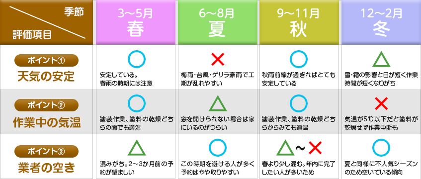 しかし、塗料の乾きや工期・予約の取りやすさなど、季節によって少なからず施工に影響はあります。